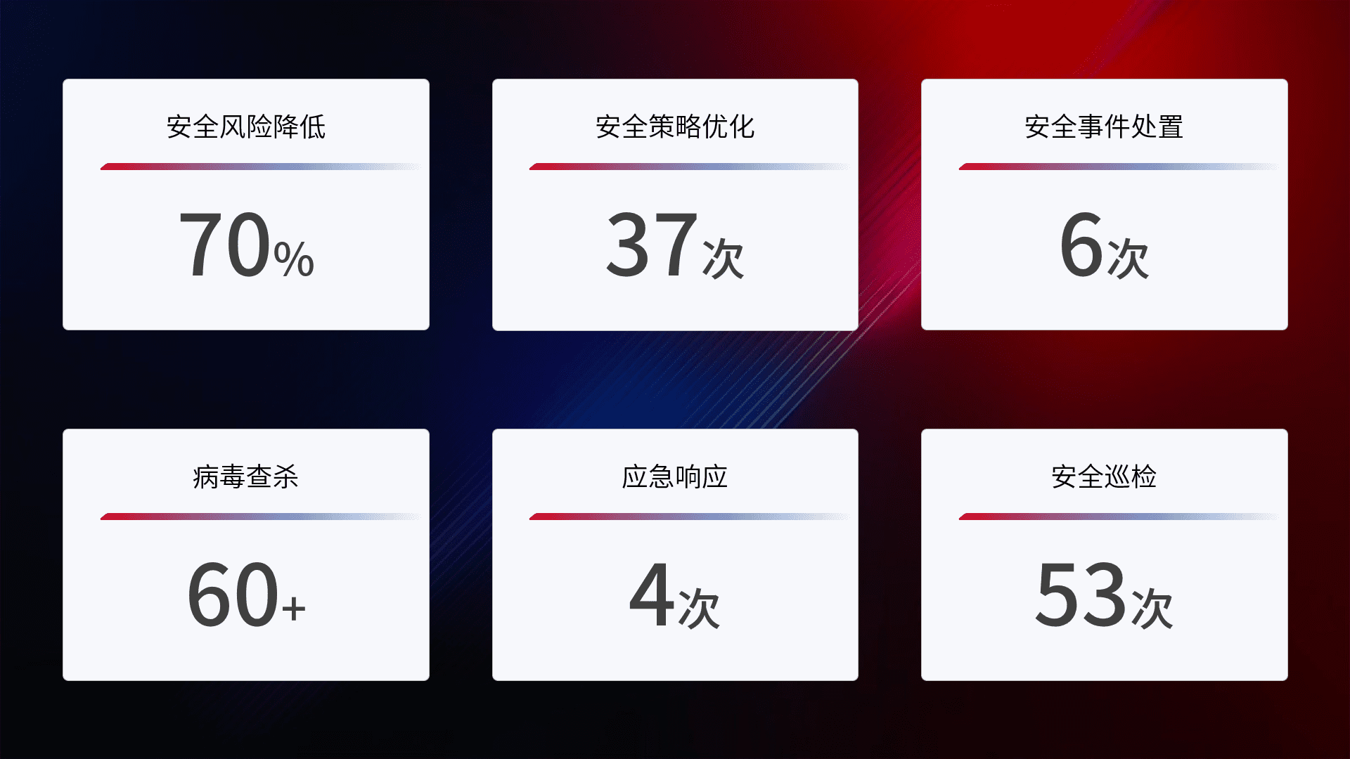提供全面的安全事件报告体系,,,,包括处置报告、、周报、、、季度和年度总结,,,,结合持续监控,,,帮助客户深入了解网络安全状况。。。