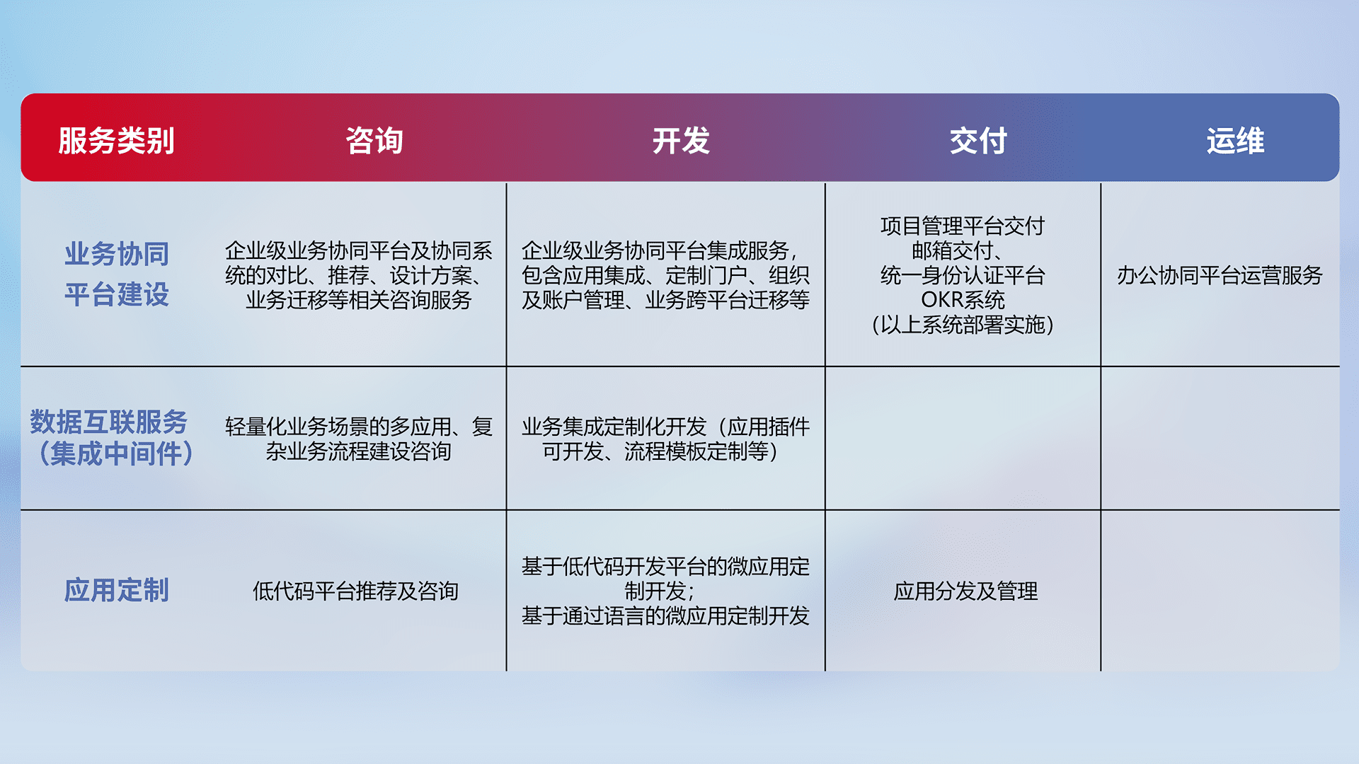 针对钉钉、、、企微、、、、IDaas等平台级产品提供产品的规划、、、、方案、、、、交付、、、定制化开发等服务,,,,实现如统一协同办公、、智能客户服务、、、、混合会议管理、、、智能数据查询、、、等业务场景,,,,实现数字化转型。。