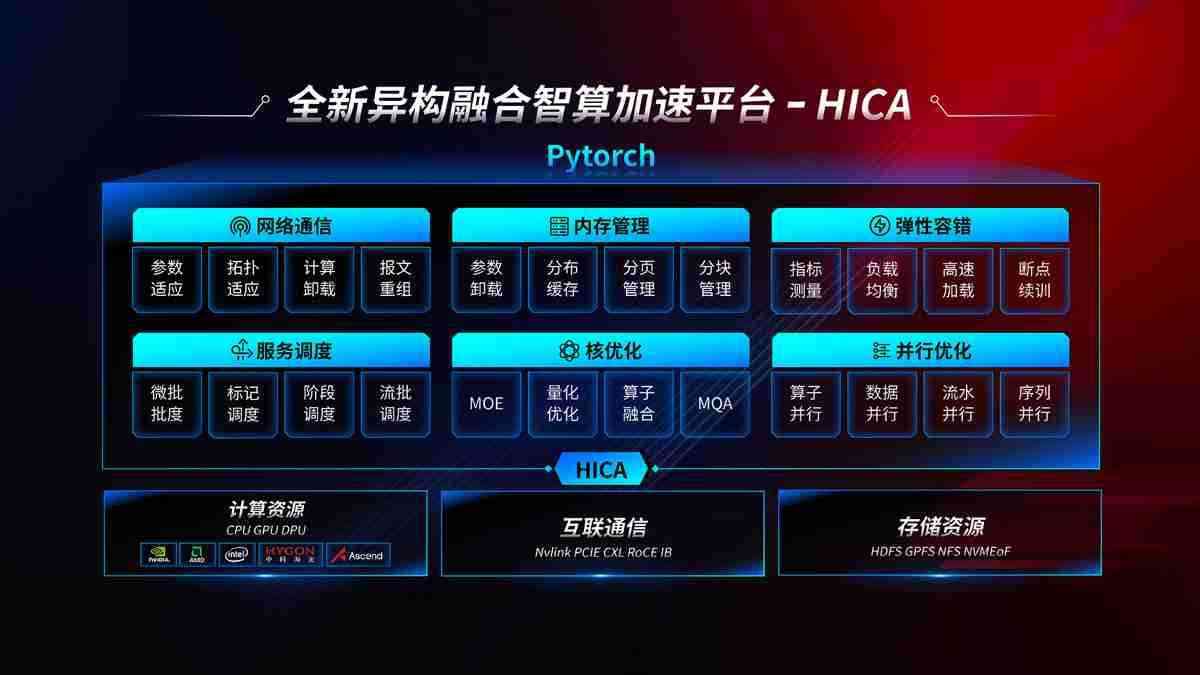 通过自研的服务层、、、中间适配层、、、、以及调度编排算法,,采用数据并行、、、、模型并行等多种并行方式,,把并行计算任务进行有效的分解,,,,使其分别由相应的软件栈和算力资源来承接。。。。当GPU资源变化,,HICA可以实时动态调度计算子任务并调整模型拓扑和架构,,以充分聚合各种算力资源。。