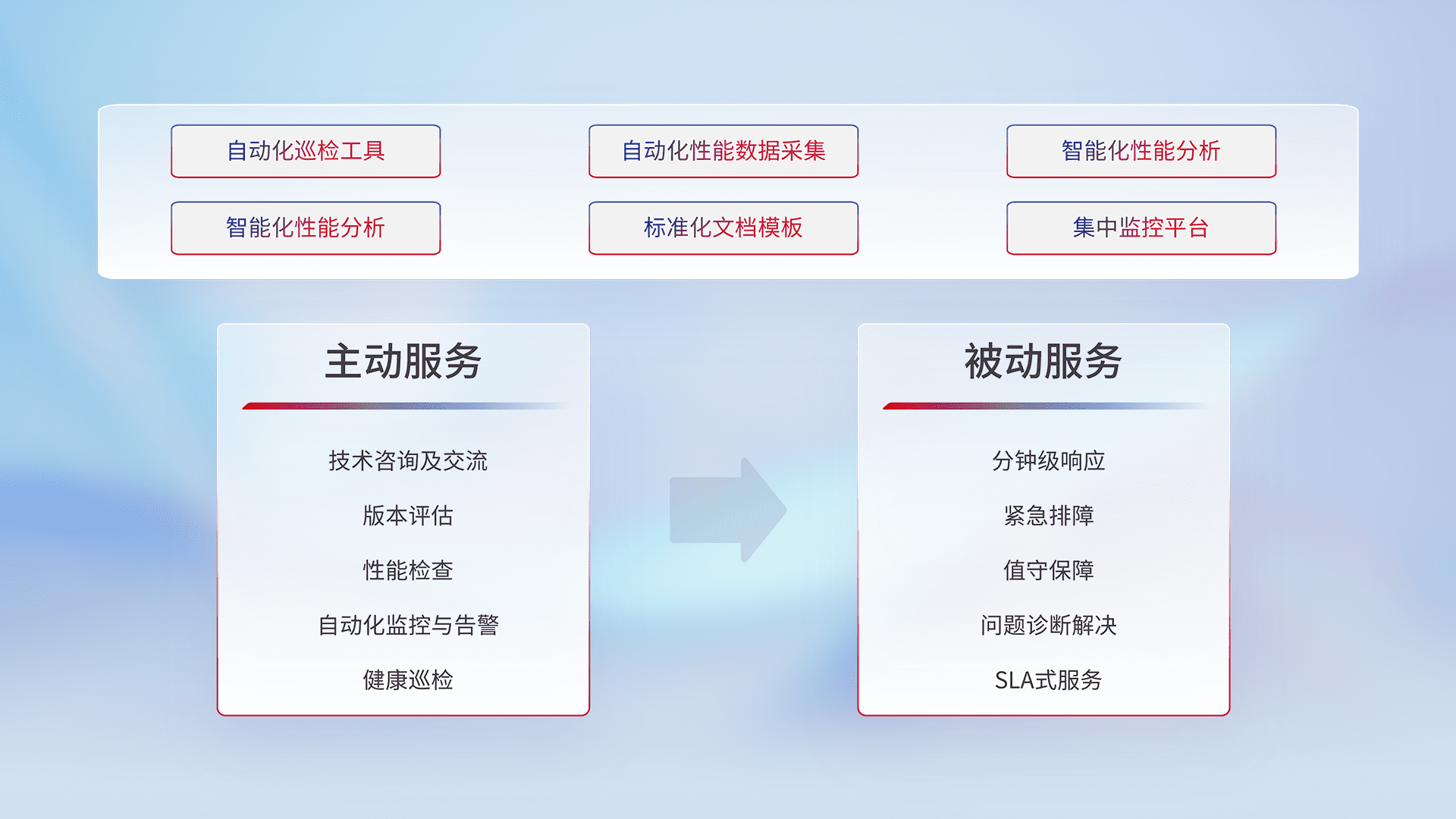 智能化工具和标准化文档,,,保障服务质量,,,提供主动服务(包含技术咨询、、、、版本评估、、、、性能检查、、自动化监控与告警、、、、健康巡检)和被动服务包含(分钟级响应、、、、紧急排障、、、、值守保障、、问题诊断解决、、、、SLA服务)。。。