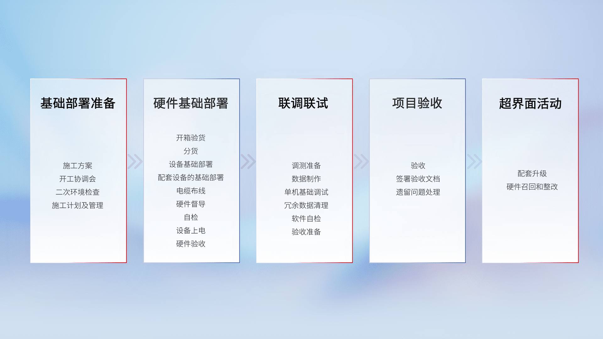 从基础部署准备、、硬件基础部署、、、联调联试、、项目验收、、、越界面活动的全过程可追溯,,保证施工质量和进度。。。